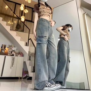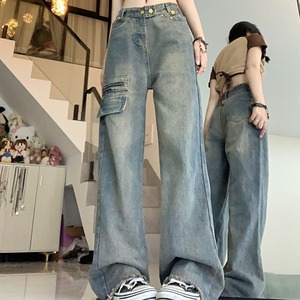 港风做旧毛边牛仔裤女夏季宽松直筒阔腿长裤小众水洗潮牌拖地裤子