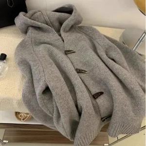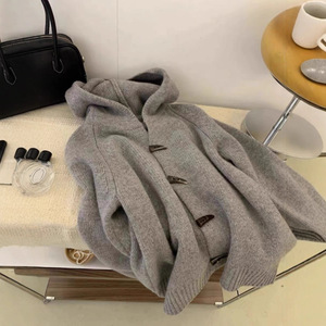 复古灰色毛衣卫衣女秋冬浣熊绒牛角扣连帽开衫外套慵懒风宽松上衣