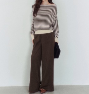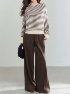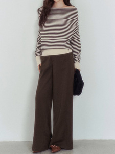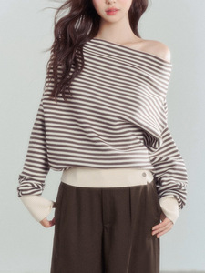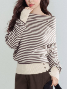 秋日摩卡'复古设计感一字肩条纹韩系休闲针织毛衣上衣