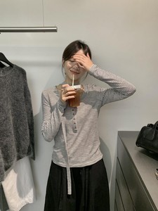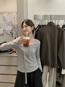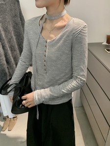MISS密思家-秋季新款韩系条纹单排扣圆领长袖T恤女89035(配飘带)