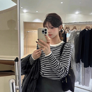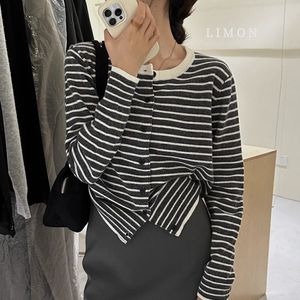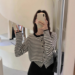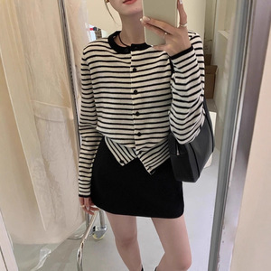 韩系高级感黑白条纹针织开衫女春秋针织衫内搭打底正肩收腰短上衣