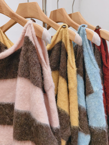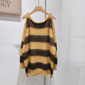 韩国chic秋冬季韩系设计感条纹一字领露肩毛衣女外套软糯针织上衣