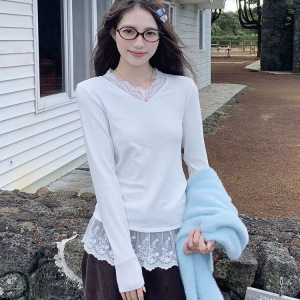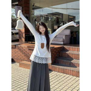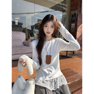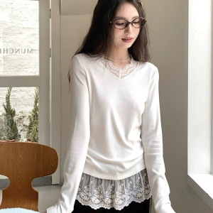 白色圆领v领蕾丝长袖内搭打底衫磨毛平板布修身型绣花公主袖