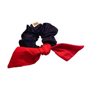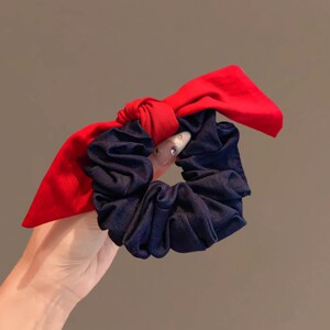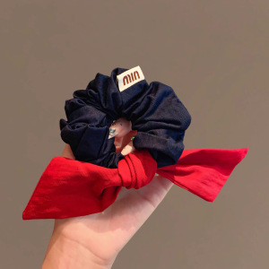蓝牛仔布艺红蝴蝶结发圈女2025新款气质百搭肠圈头绳发饰扎马尾女