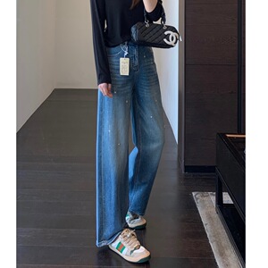 泽黛佳伊 奢华烫钻 高品质牛仔裤高腰宽松显瘦直筒阔腿裤女秋冬新