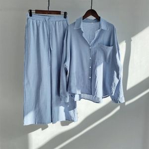 2023春夏跨境棉麻复古大码两件套女宽松长裤衬衫套装女外贸批发