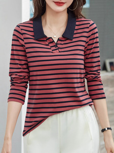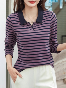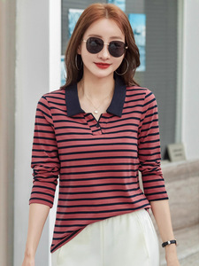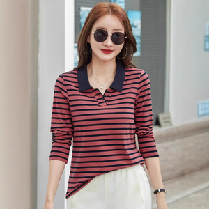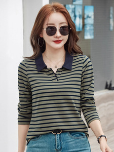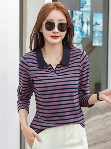 537新款条纹polo衫大码女装秋季长袖打底韩版休闲t恤减龄上衣翻领