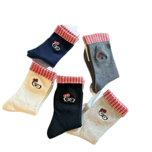 新款简约韩系新品格子翻口两穿眼睛猫咪可爱卡通中筒袜