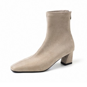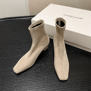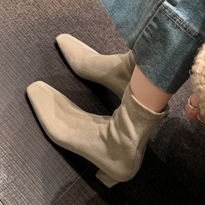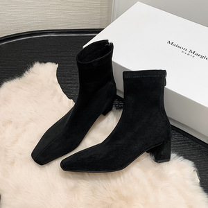 2025秋冬季绒面时尚显瘦弹力靴子后拉链加绒方头粗跟短靴4142大码