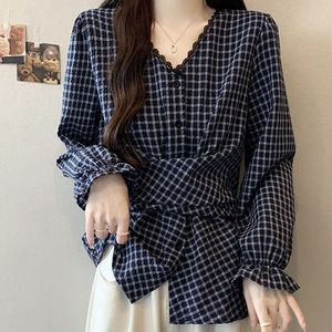 格子V领长袖打底衬衫女2025年秋新款时尚设计感系带收腰显瘦上衣