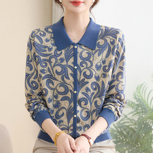 中老年春秋季薄款气质印花时尚妈妈套头衫新款假开衫翻领针织小衫