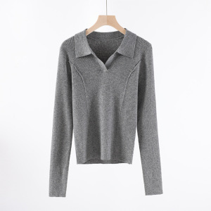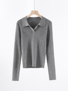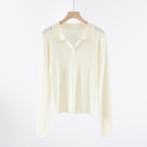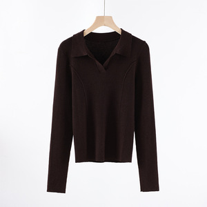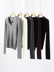 老钱风超细羊毛POLO领上衣女修身显瘦打底衫V领长袖薄款针织衫
