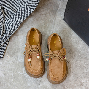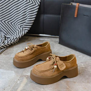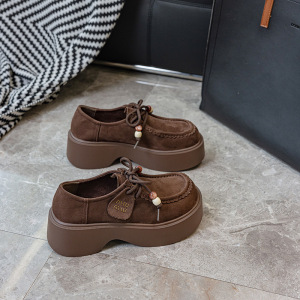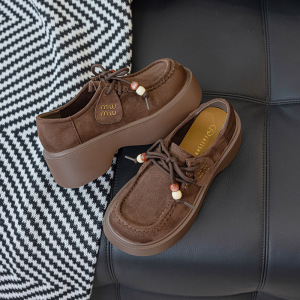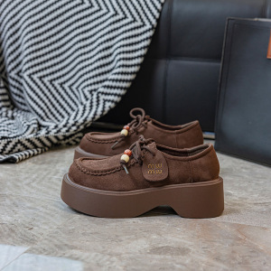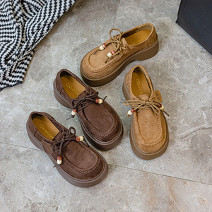 厚底袋鼠鞋复古圆头系带鞋2025秋季新款英伦风百搭小个子乐福鞋女
