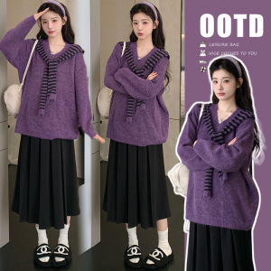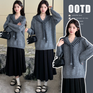 孕妇装秋季新款假两件韩版宽松时尚毛衣+毛呢百褶裙甜美显瘦套装