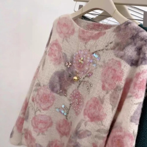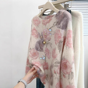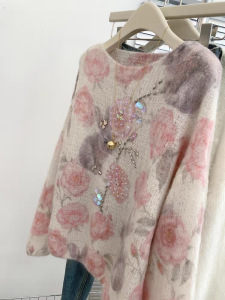 重工钉珠亮片粉色印花马海毛套头外穿慵懒风宽松女士针织毛衣新款