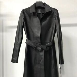 2025秋冬气质翻领优雅皮衣外套女纯色中长款收腰时尚显瘦系带风衣