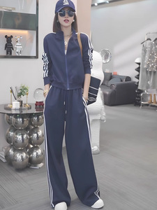 欧洲站时尚直筒休闲长裤一整套拉链开衫简约长袖通勤上衣两件套女