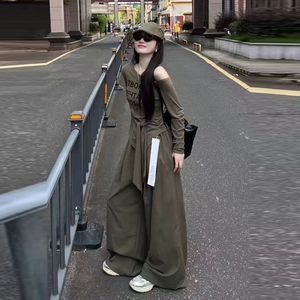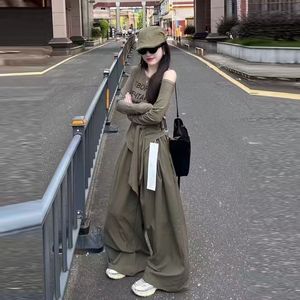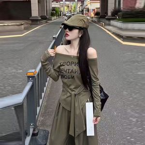 早秋时尚新款斜肩套装印花2025绑带长袖T恤上衣高腰休闲风两