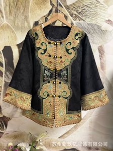 重工刺绣立领外套女2025新款民族风复古盘扣圆领长袖提花缎面上衣