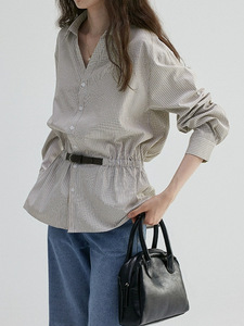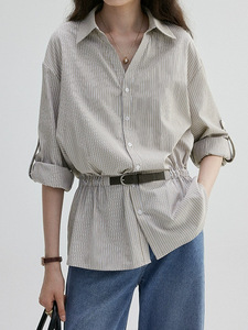 槿一 设计V领收腰条纹宽松衬衫女早秋新款气质通勤上衣显瘦复古风