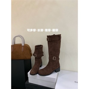 粗跟圆头绒面中筒靴女2025秋冬新款时装靴两穿女靴复古皮带扣短靴