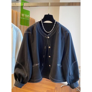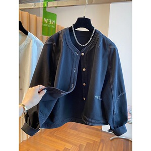 高级感明线黑色牛仔外套女春秋2025新款宽松休闲无领薄款夹克上衣