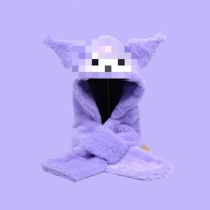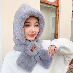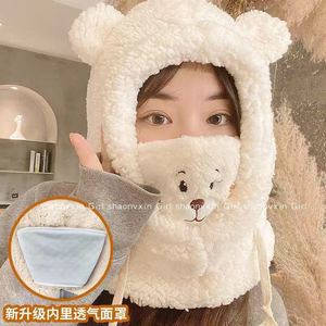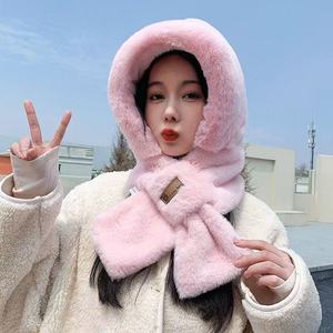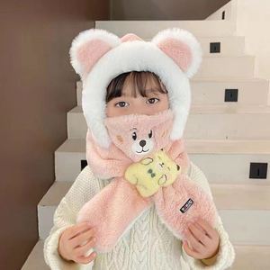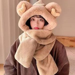 卡通小熊毛绒保暖帽子女秋冬围巾一体围脖帽骑车防寒护耳套头帽
