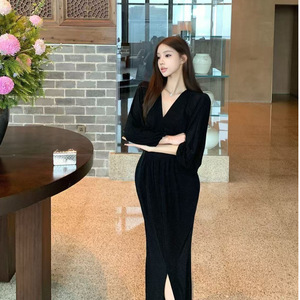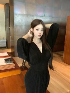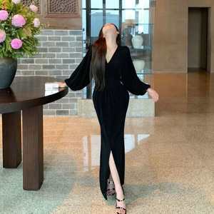 名媛气质时尚御姐蓬蓬袖V领连衣裙收腰开叉过膝裙子简约包臀长裙