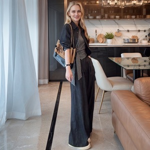 跨境时尚套装2025新款韩版三件套格纹吊带长袖短外套休闲阔腿裤