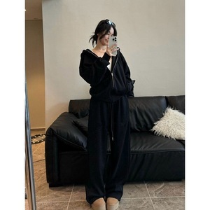 卫裤斤胖两件套休闲运动套装女秋冬季宽松大码连帽卫衣蓝色黑色