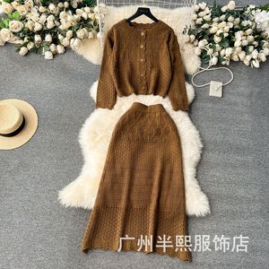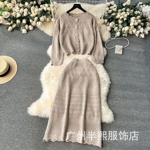 秋冬美拉德穿搭女甜美温柔镂空针织上衣两件套女收腰波浪边半身裙