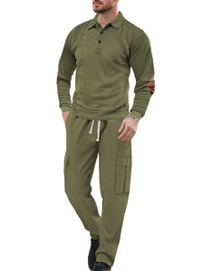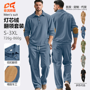 外贸亚马逊跨境欧美休闲运动翻领长袖两件套男士宽松纯色工装套装