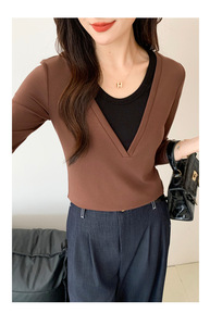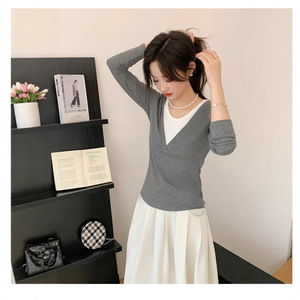 撞色拼接假两件长袖t恤男女2025秋季新款修身显瘦休闲上衣打底衫
