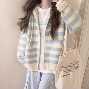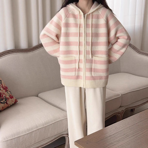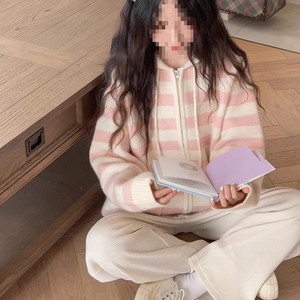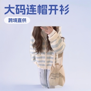 亚马逊跨境大码宽松拉链连帽针织毛衣开衫外套女甜美软糯风