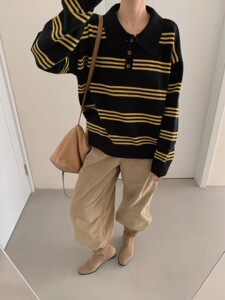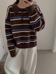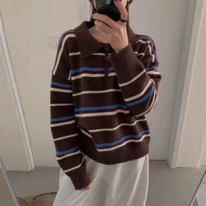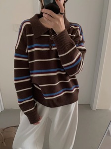 复古撞色条纹polo翻领长袖毛衣女秋冬韩系休闲宽松显瘦针织衫上衣