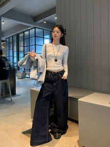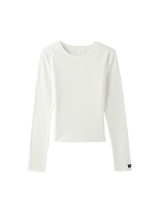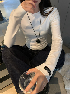 宋正恩白色正肩长袖t恤女春季磨毛修身圆领短款内搭打底衫小上衣