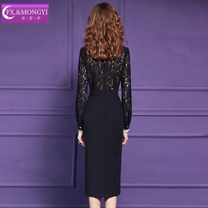 菲梦伊原创钉珠蕾丝黑色连衣裙女长袖秋装名媛轻熟精致收腰包臀裙
