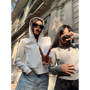 灰色短款连帽卫衣外套女款初秋2025新款拉链修身大衣内搭显瘦上衣