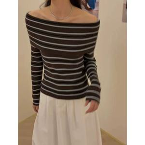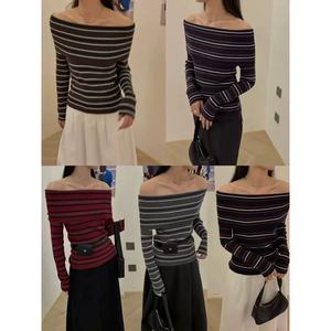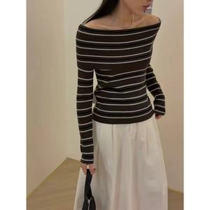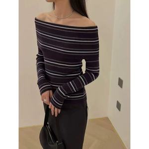 韩系chic别致撞色条纹一字肩长袖针织衫女秋设计感小众修身打底衫