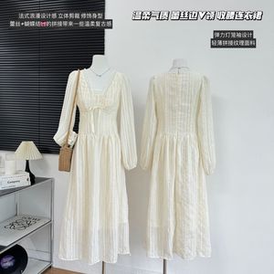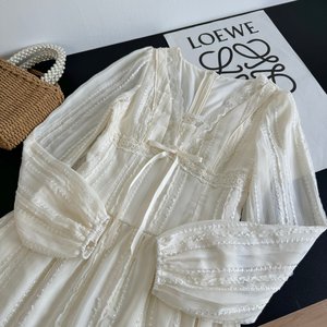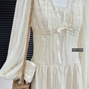 实拍Acaine秋季新款长裙v领收腰长袖白月光名媛复古气质连衣裙女