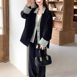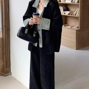 韩版感牛仔拼接西装外套阔腿裤两件套女春秋季新款西装套装