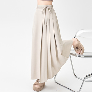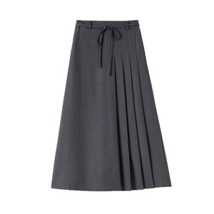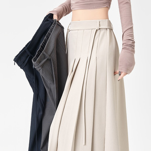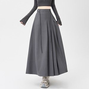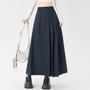 藏青色西装半身裙女秋季2025新款高腰垂感绑带A字中长款百褶裙子