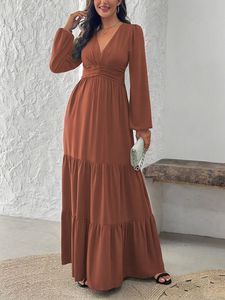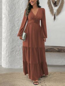 跨境女装外贸亚马逊新款优雅v领泡泡袖荷叶边连衣裙长袖秋冬长裙