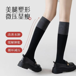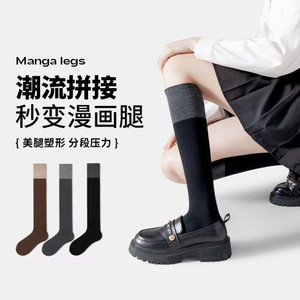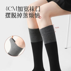 拼色小腿袜子女春秋款黑灰拼接日系过膝袜半腿微压黑色微压设计