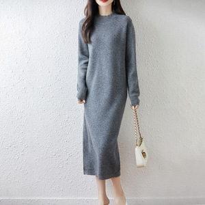 半高领针织连衣裙女100纯羊毛裙秋冬宽松中长款毛衣裙套头打底裙