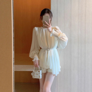 2025新款法式扭结圆领白色雪纺衫灯笼袖上衣+高腰短裤气质两件套