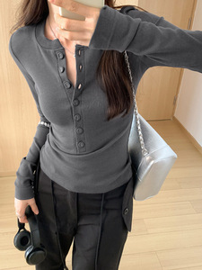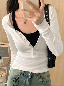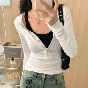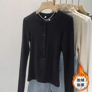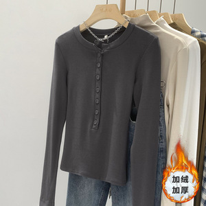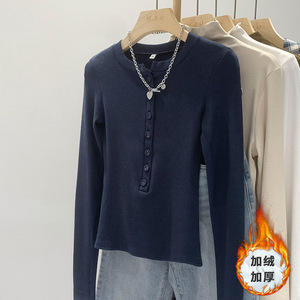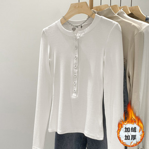美式复古排扣长袖t恤女2025秋季加绒修身显瘦白色内搭打底衫上衣