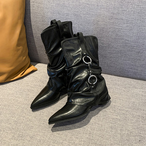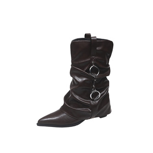 2025新款复古尖头金属扣褶皱短靴粗跟裤管靴女堆堆靴棕色宽筒靴子