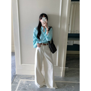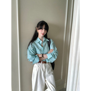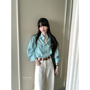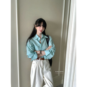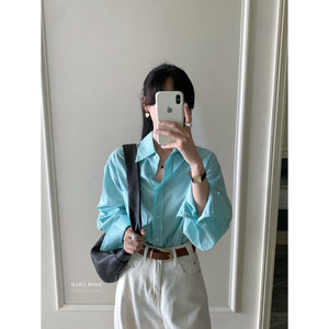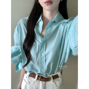 DARA ROSE-韩国时髦洋气薄荷色条纹翻领单排扣宽松衬衣衬衫S2583