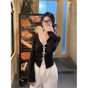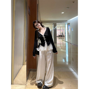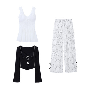 蝴蝶结叠穿长袖针织衫蕾丝吊带背心波点阔腿裤女秋季新款时尚套装